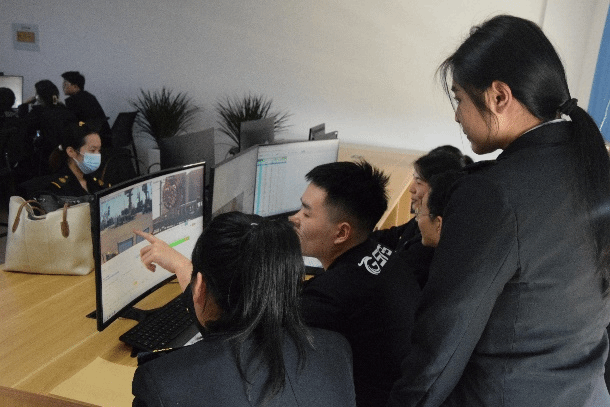 本次培训学习包括原木智能理货和现场作业参观。学生走进原木智能理货操作室,现场观看学习远程原木智能理货。整齐划一、身着工装的理货员坐在电脑前,时而点击鼠标操作系统,时而用对讲机与现场工人进行交流,无需身临其境,码头现场生产作业尽收眼底。下午,学院师生走进岚山港木材作业现场,只听机械轰鸣,却不见理货员的身影。过去,理货员常常需要头顶烈日、身披风雪到现场进行理货。如今,理货员的办公场所从室外搬到室内,只需坐在中控台前,通过电脑操作便能轻松完成木材理货作业。