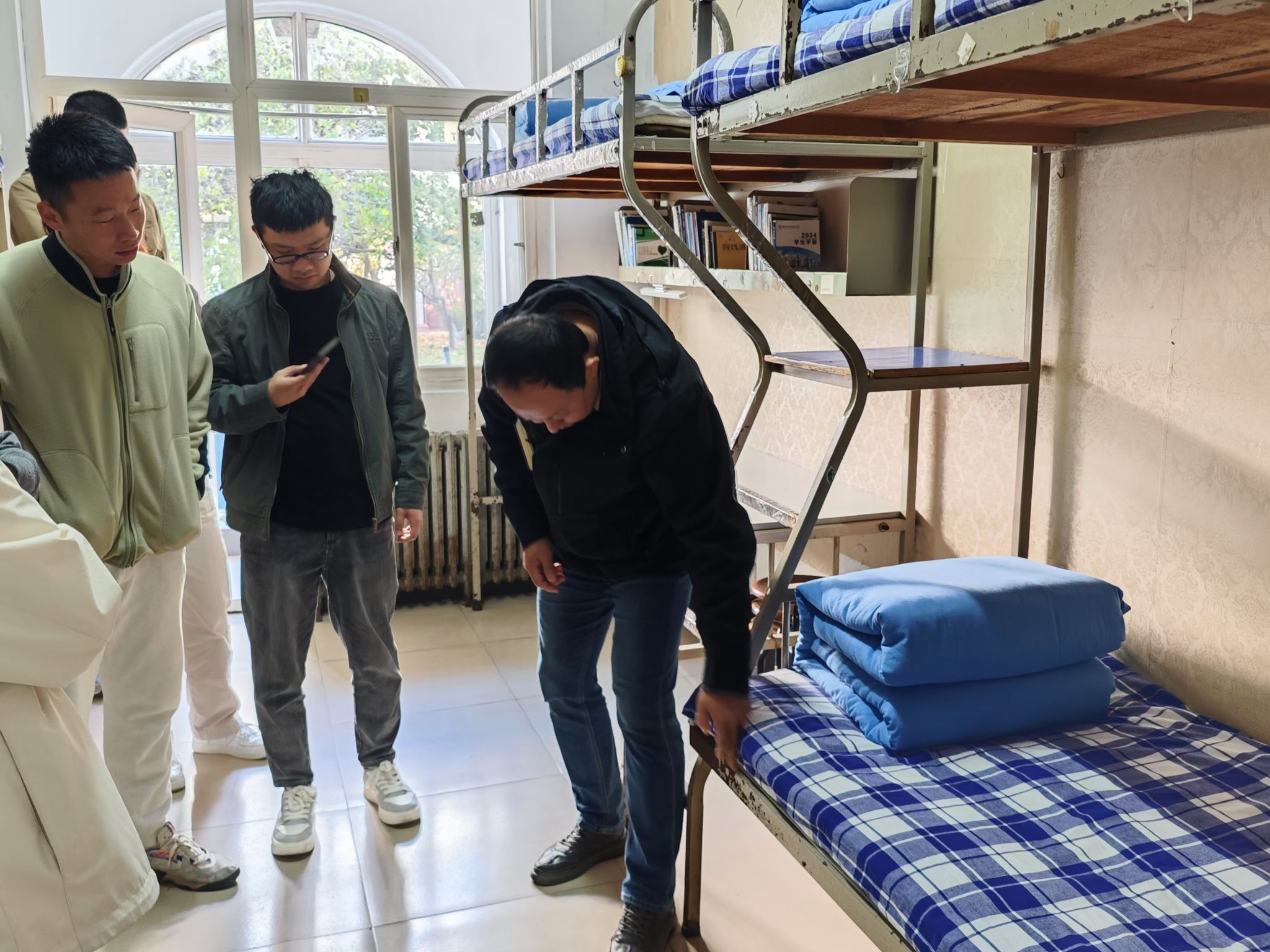在现场检查中,辅导员们首先参观了标准间,姜哲详细讲解了内务整理的规范要求,展示了标准化的整理方法。随后,大家对学生宿舍的内务整理情况进行了全面检查。针对现场发现的问题,姜哲提出了改进意见,并亲自示范规范的内务整理方法,强调细节管理在宿舍管理中的重要性。他指出,全体辅导员应高度重视宿舍管理工作,将半军事化管理的标准和要求落实到日常管理中,确保学生在安全、有序、整洁的环境中生活。