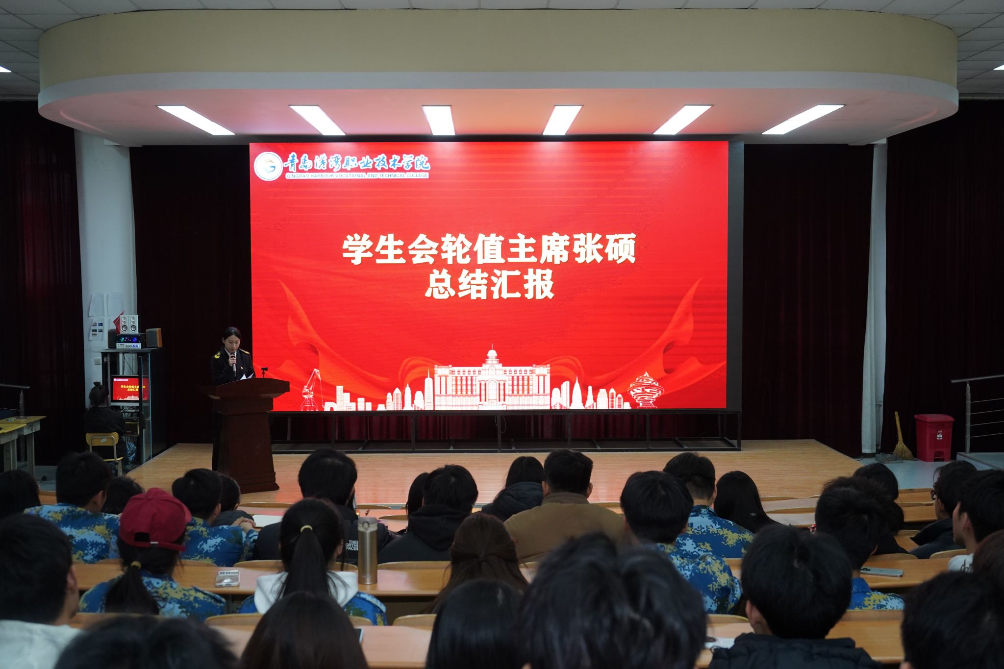 学生会轮值主席张硕、郑煜川分别代表学生会作总结汇报,总结经验并提出改进方向。随后,各部门代表依次发言,从工作成果、不足与改进到未来规划进行了汇报。李吉妮在总结讲话中充分肯定了学生会、自委会本学期的努力与成绩,并对汇报中的问题进行指导纠正。她勉励学生珍惜期末复习时间,努力备考,不断提升自身综合能力,为新学期工作打下扎实基础。