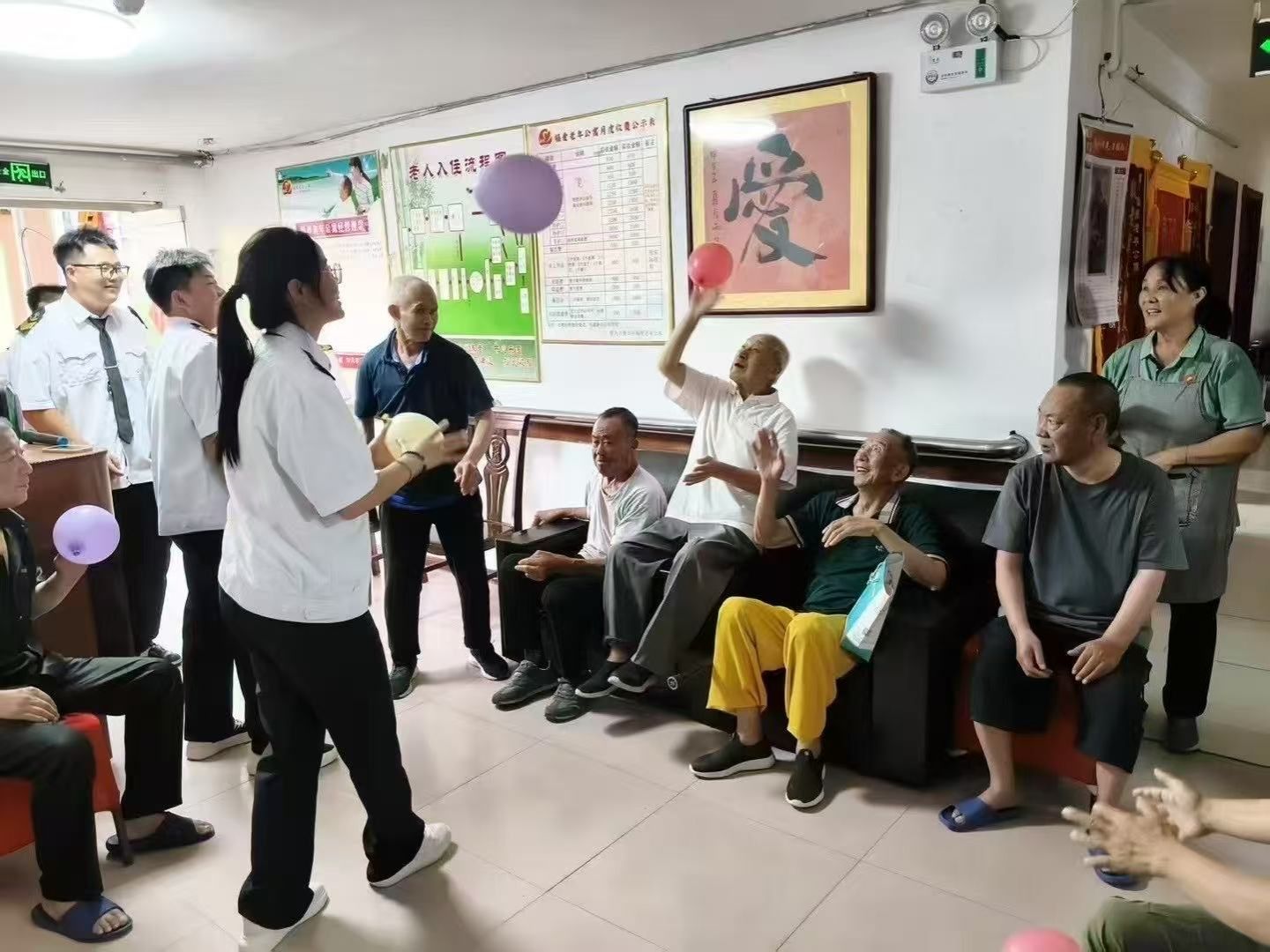 志愿者们为老人们精心准备了丰富多样的文娱活动。拍手操环节中,志愿者耐心教学,带领老人们跟随节奏舒展肢体,现场洋溢着欢快的笑声;在折纸互动中,彩纸在志愿者的指导下逐渐变成一件件精美的手工作品,既锻炼了老人的动手能力,又丰富了日常生活;传气球游戏更是将现场氛围推向高潮,轻盈的气球在志愿者与老人间传递,承载着浓浓的关爱与温暖。活动现场充满了欢声笑语与阵阵掌声,营造出其乐融融的氛围。