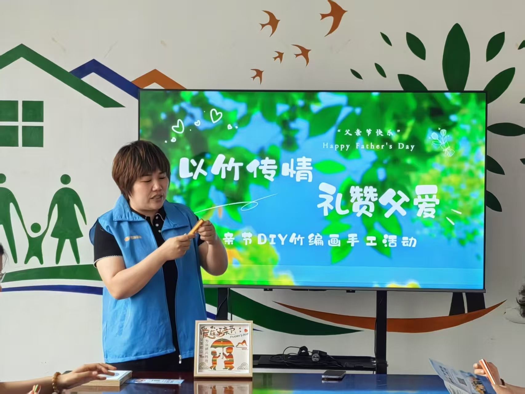 活动现场,志愿者们充分发挥创意巧思,将竹编作品精心装裱进相框之中。从造型设计到细致粘贴,每一个步骤都凝聚着对父亲的深情祝福与感恩之情。面对社区记者,志愿者表示:“虽然父亲不在身边,但把亲手制作的竹编手工拍照发给他,同样能传递我们的爱意与思念。”一件件充满心意的竹编作品,成为子女与父亲之间传递亲情、表达感恩的温馨纽带。