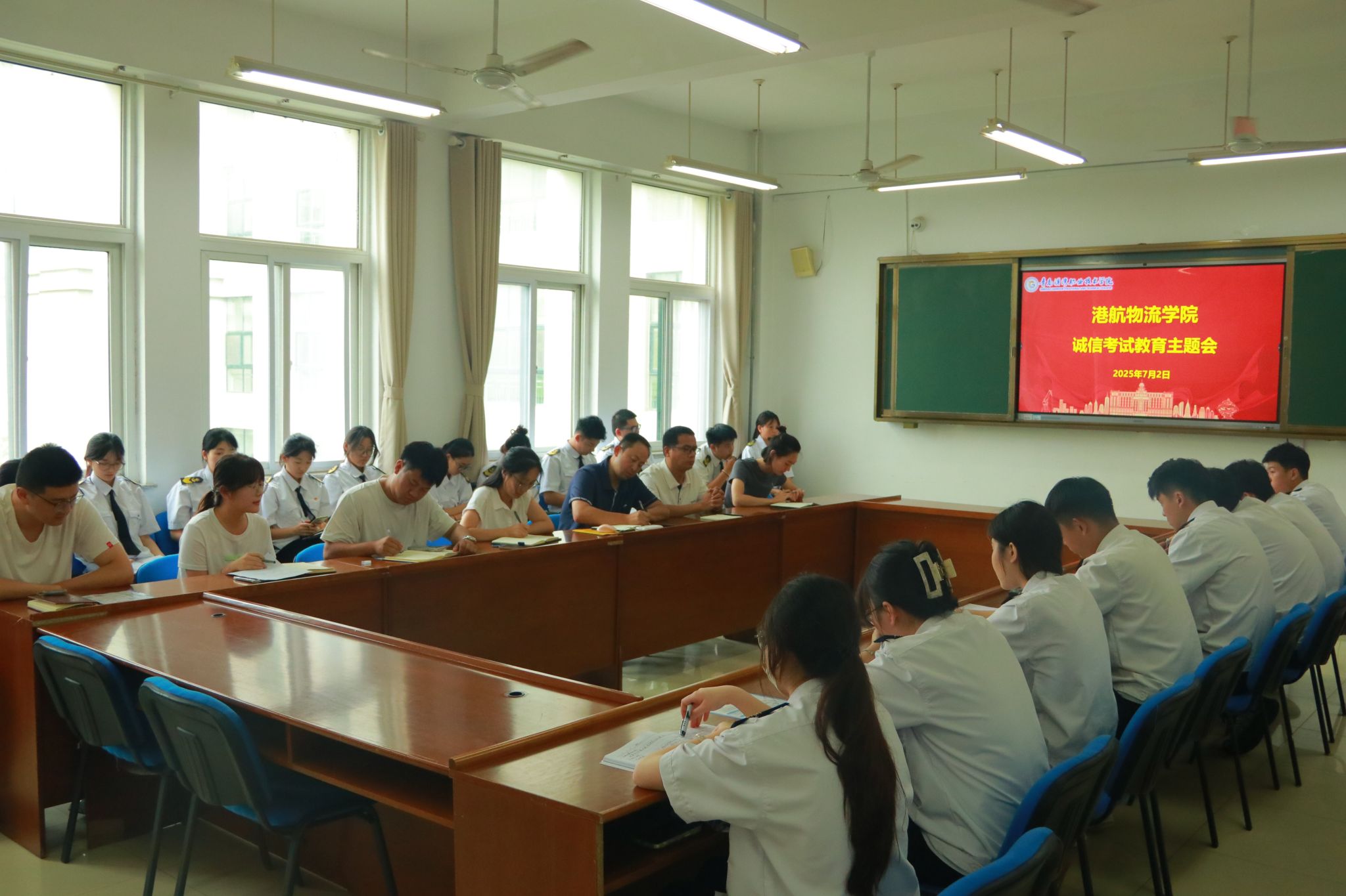 姜哲指出,学生干部要提高思想认识,强化责任担当,不仅自身要严格遵守考试纪律,更要在班级中发挥示范带动作用,营造良好风气。他强调,要通过诚信考试,展现港航学子的良好精神风貌。李吉妮就具体考试要求作出提醒。她指出,同学们要自觉遵守考试纪律,坚决杜绝作弊等违纪行为,做到诚信应考、独立答题。同时,务必携带身份证和学生证等有效证件参加考试,提前了解考场安排,避免因准备不充分影响考试正常进行。